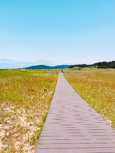 주차장에서 50m 정도를 걸어가면 신두리 해안사구로 들어가는 입구와 함께 넓게 펼쳐진 모래언덕이 보입니다. 해안사구 안으로 들어가게 되면 모래언덕의 아무 곳이나 밟으며 들어갈 수는 없고 정해진 길로만 걸어가야 합니다. 천연기념물이 사구를 보존하기 위해 데크로 조성된 산책길을 따라 걸어가야 하는데 길이 잘 조성되어 있어 걷기에는 편하지만 폭이 좁은 길이기 때문에 관광객이 많으면 이동에 불편함을 느낄 수 있습니다.